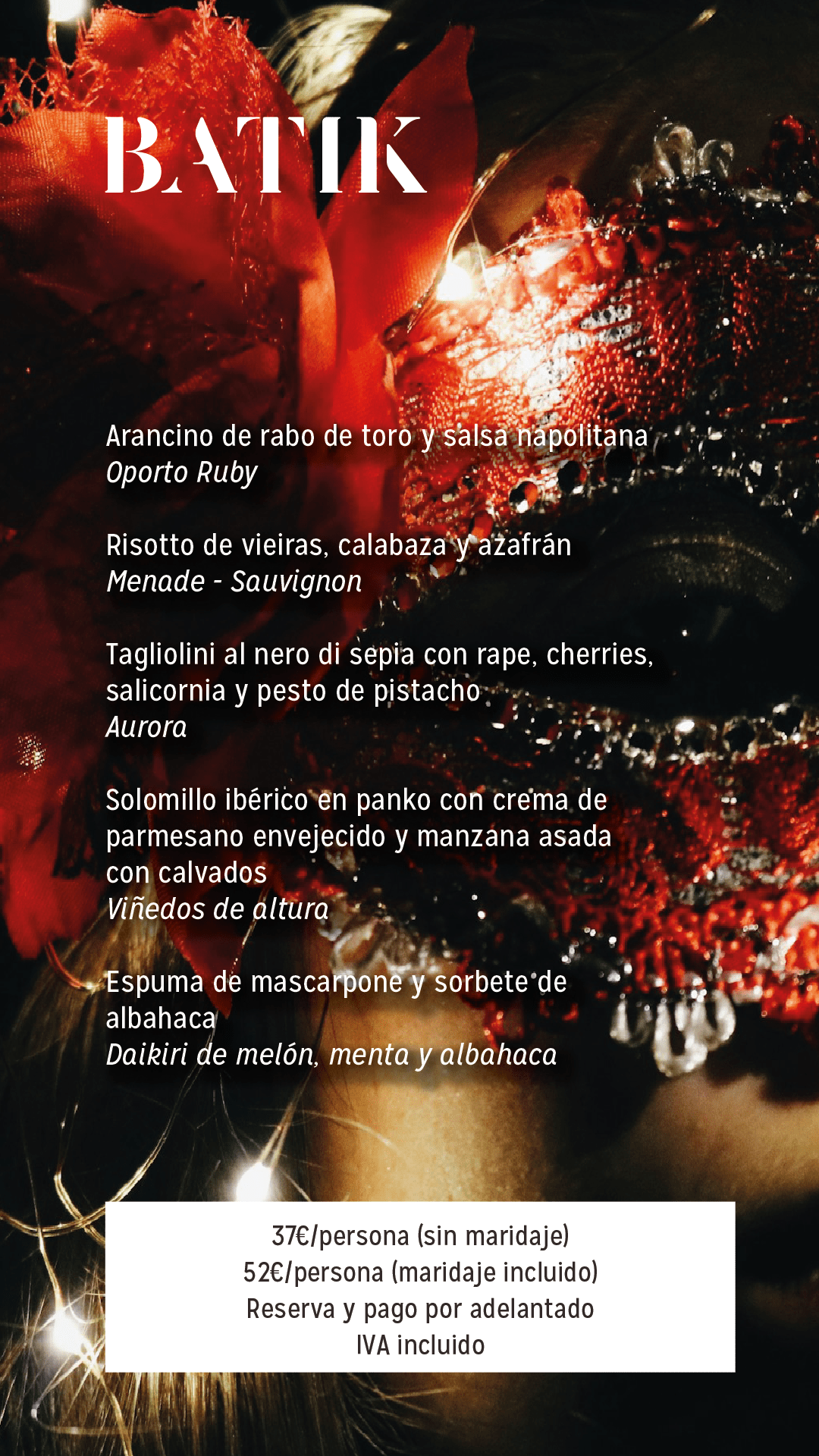 Prepárate para vivir esta noche inspirada en la elegancia y diversión del carnaval veneciano en Batik. Un menú italiano para disfrutar y un ambiente excepcional para viajar a la reina del Adriático.